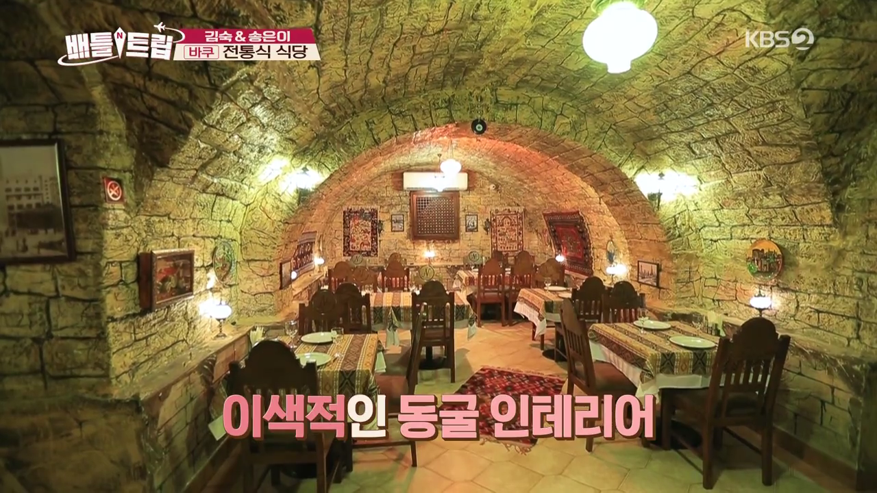 일정을 마치고 전통식 식당으로 향한 두 언니들~! 이색적인 동굴 인테리어가 눈길을 끄는 곳이었는데요. 아제르바이잔 전통 느낌이 물씬다는 소품들까지, 분위기 최고네요. ;-)