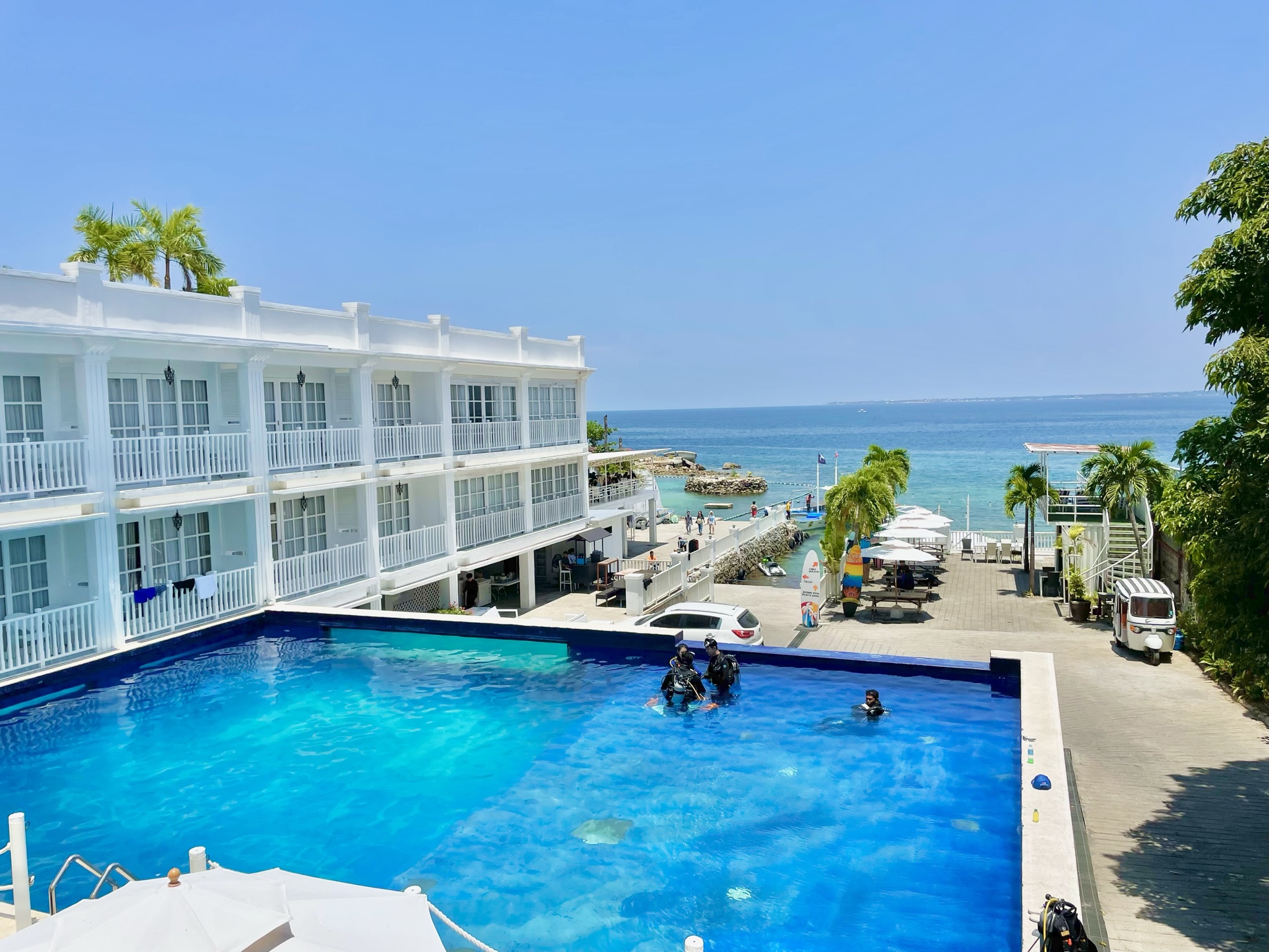 여행자들이 호핑투어나 선셋크루즈, 다이빙 등 다양한 목적으로 더마크리조트를 찾는다고 들었는데 식당 바로 아래에서 다이빙 교육 받는 모습도 볼 수 있었어요.