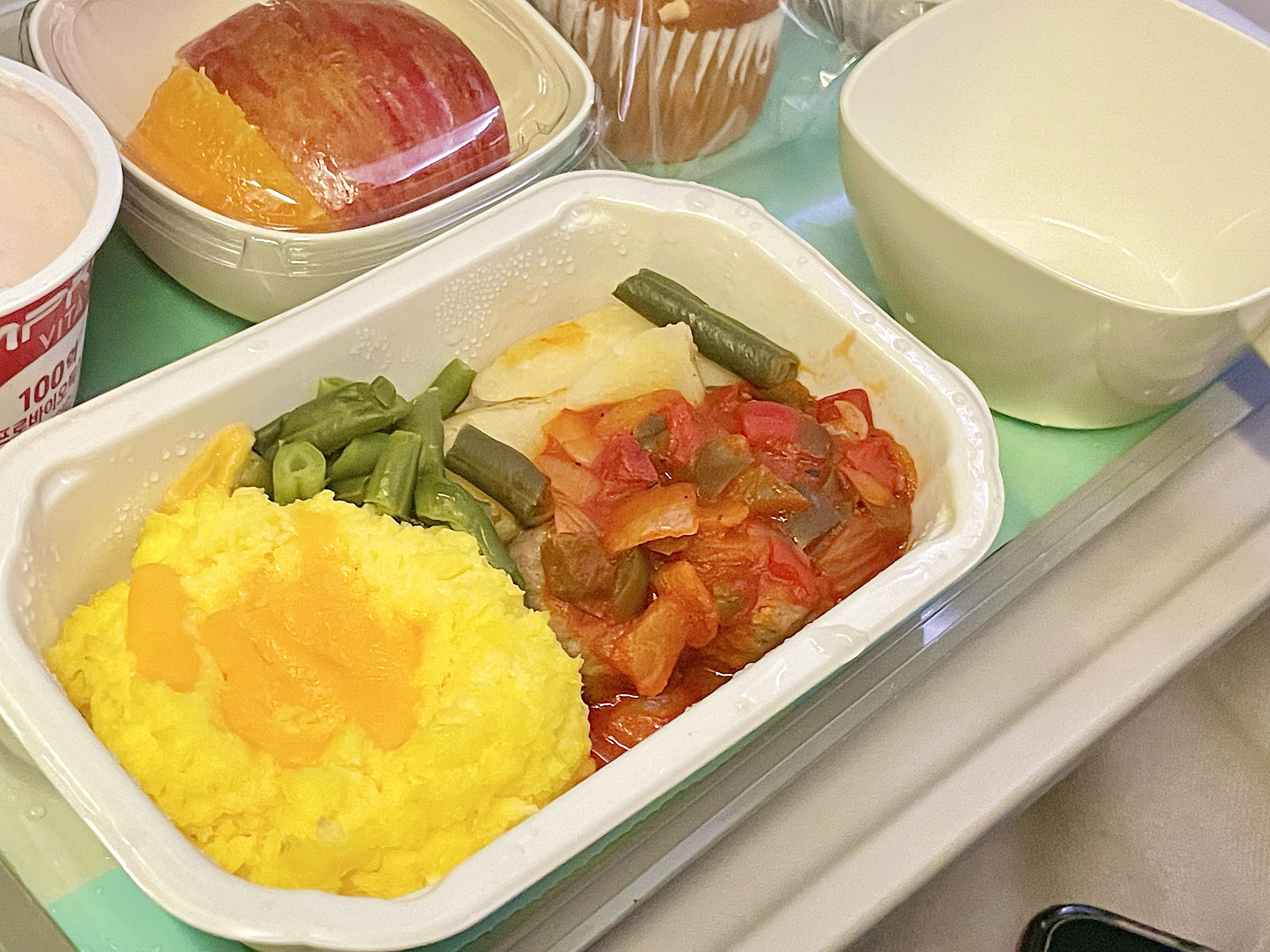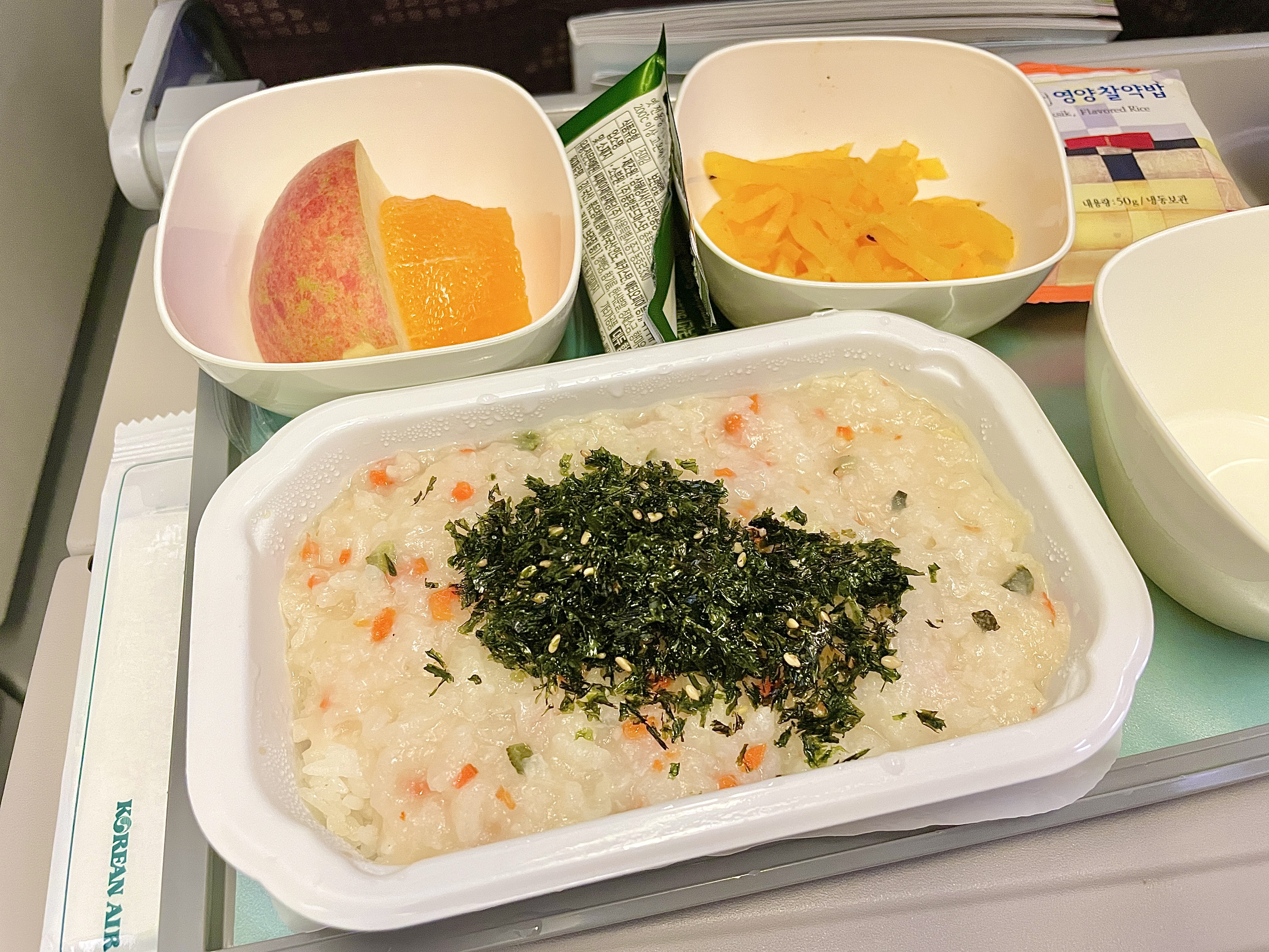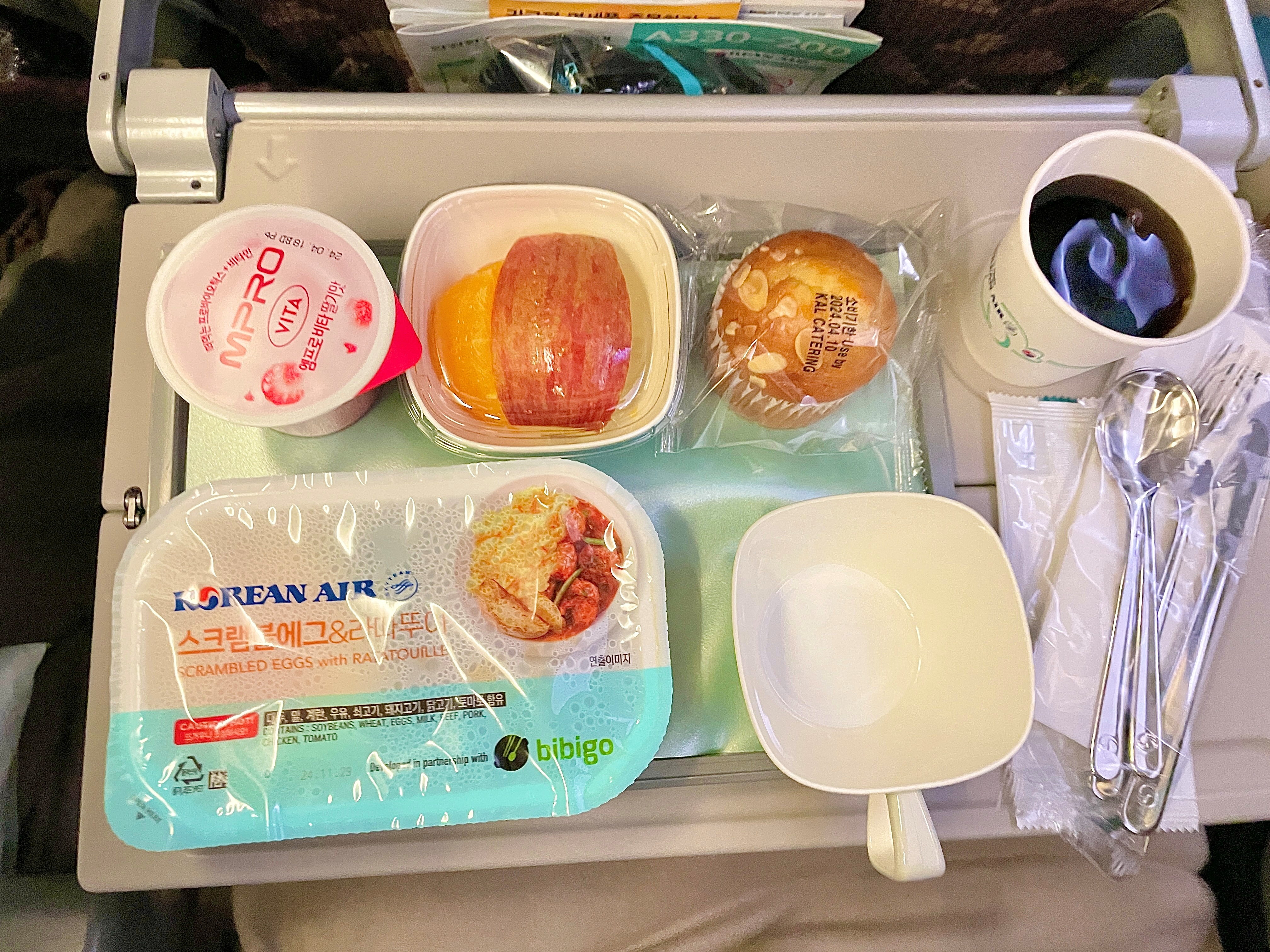 도착하지 1시간 전쯤 기내식이 나왔어요. 기내식은 야채죽, 스크램블 에그&라따뚜이 두가지였어요.