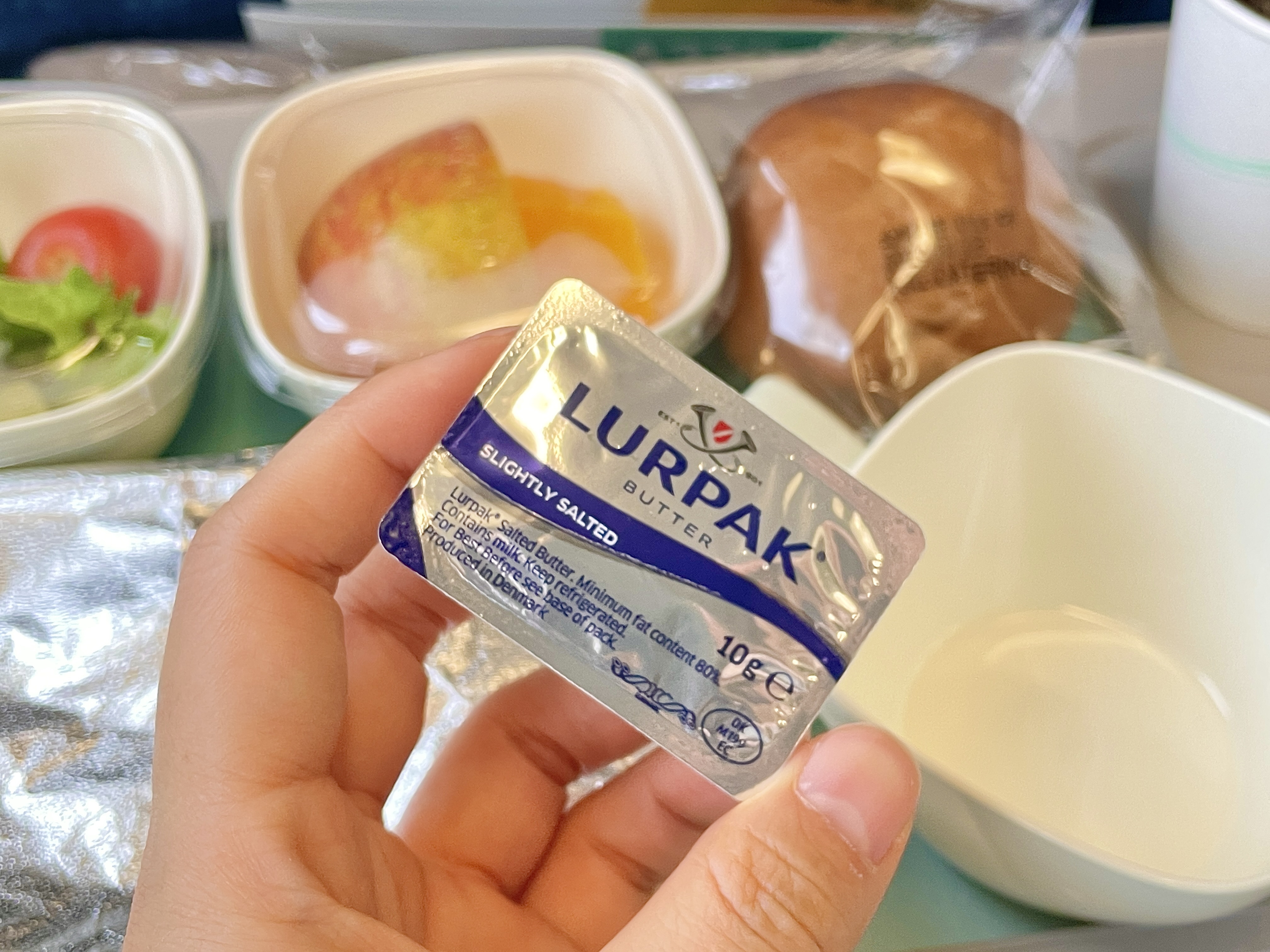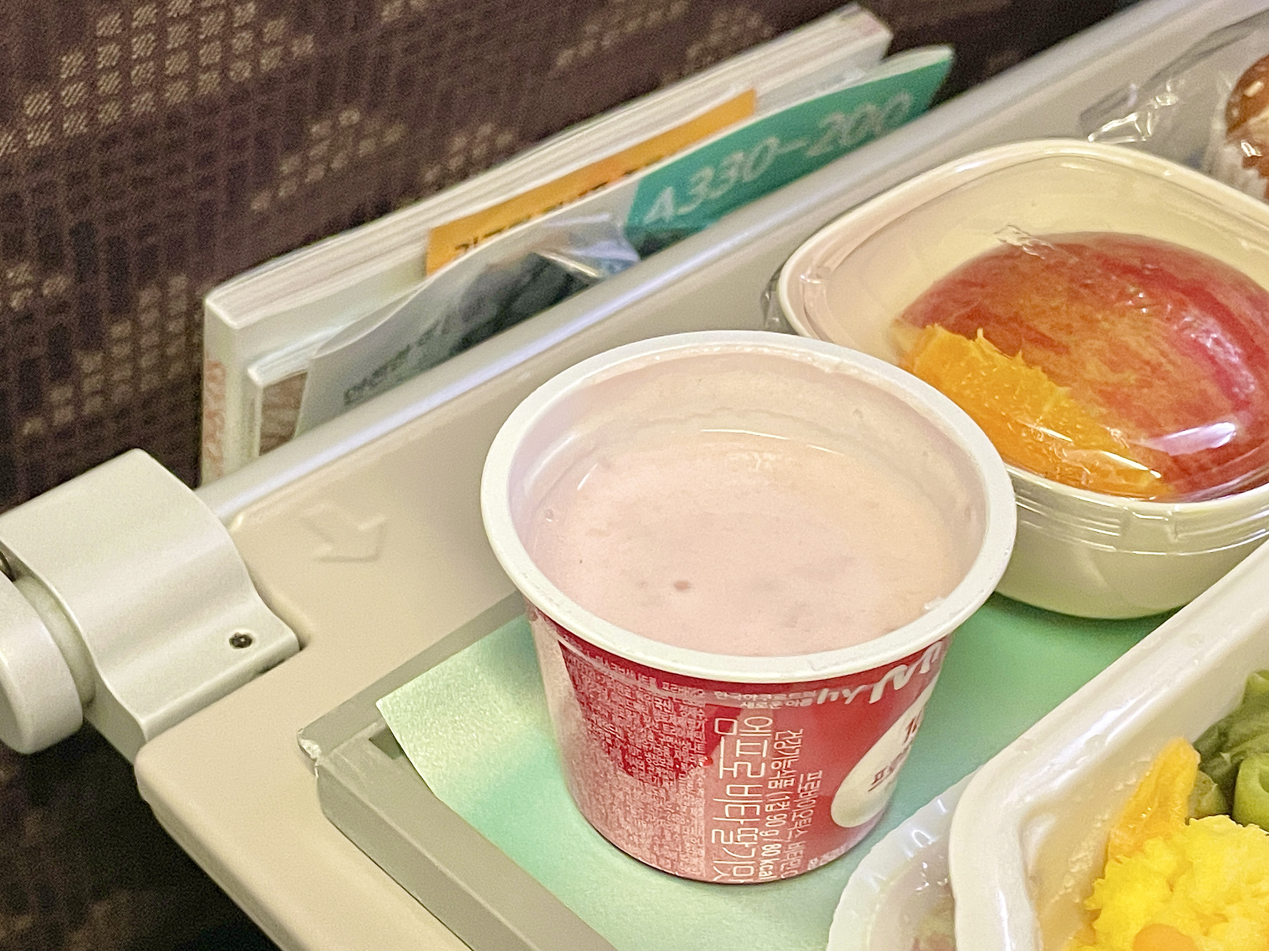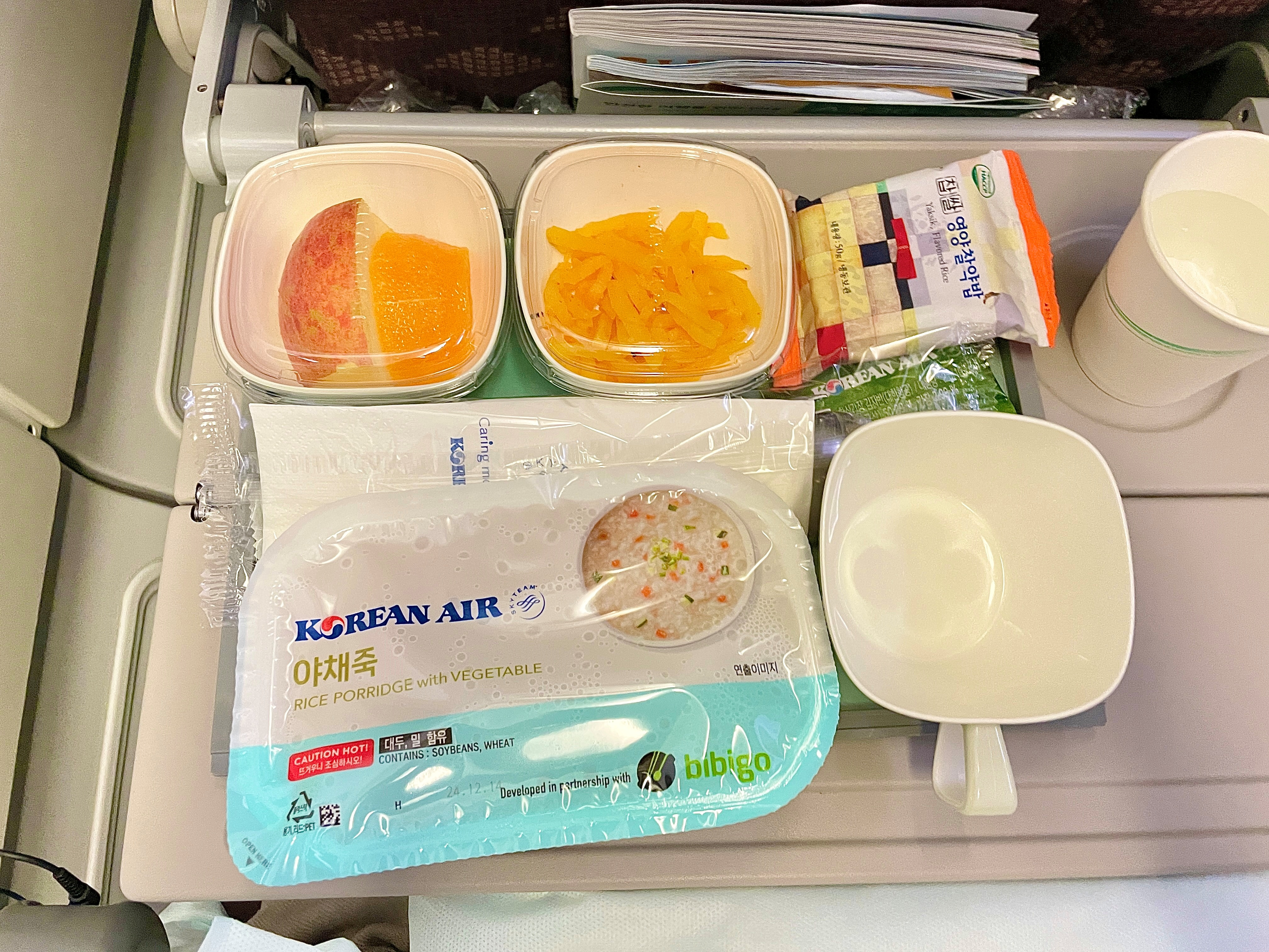도착하지 1시간 전쯤 기내식이 나왔어요. 기내식은 야채죽, 스크램블 에그&라따뚜이 두가지였어요.