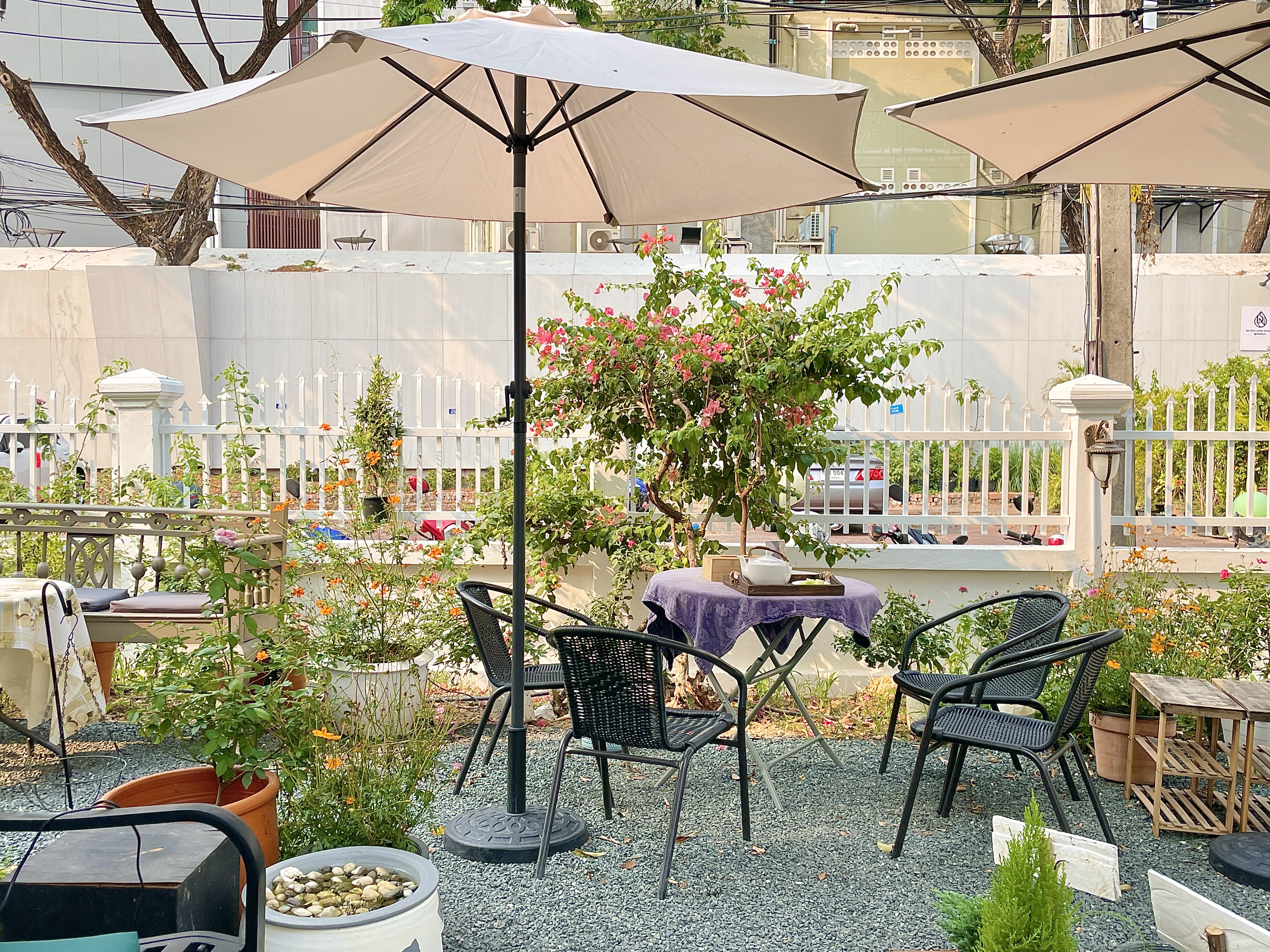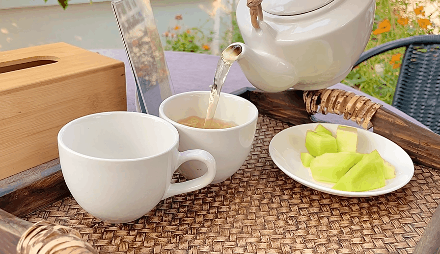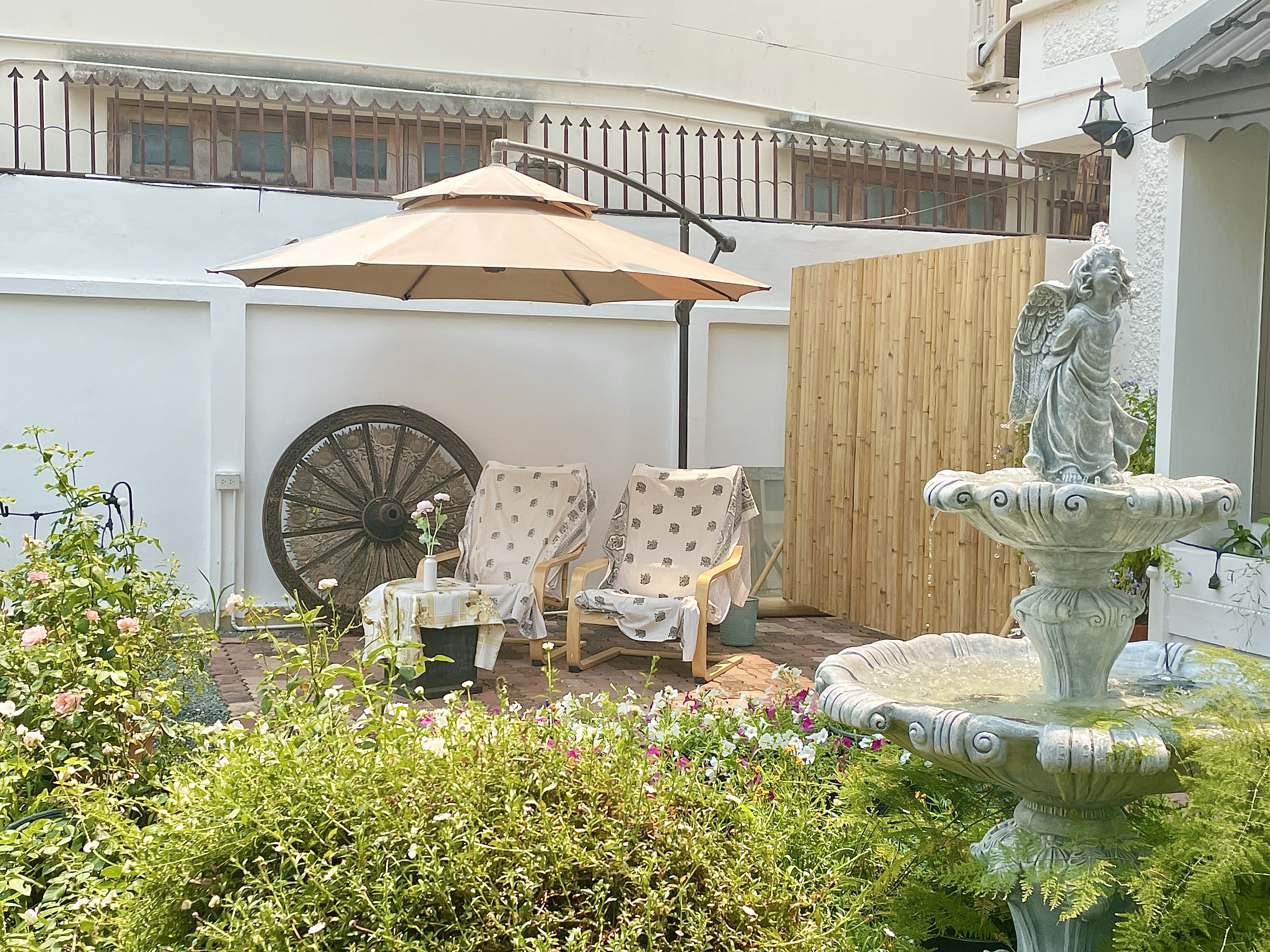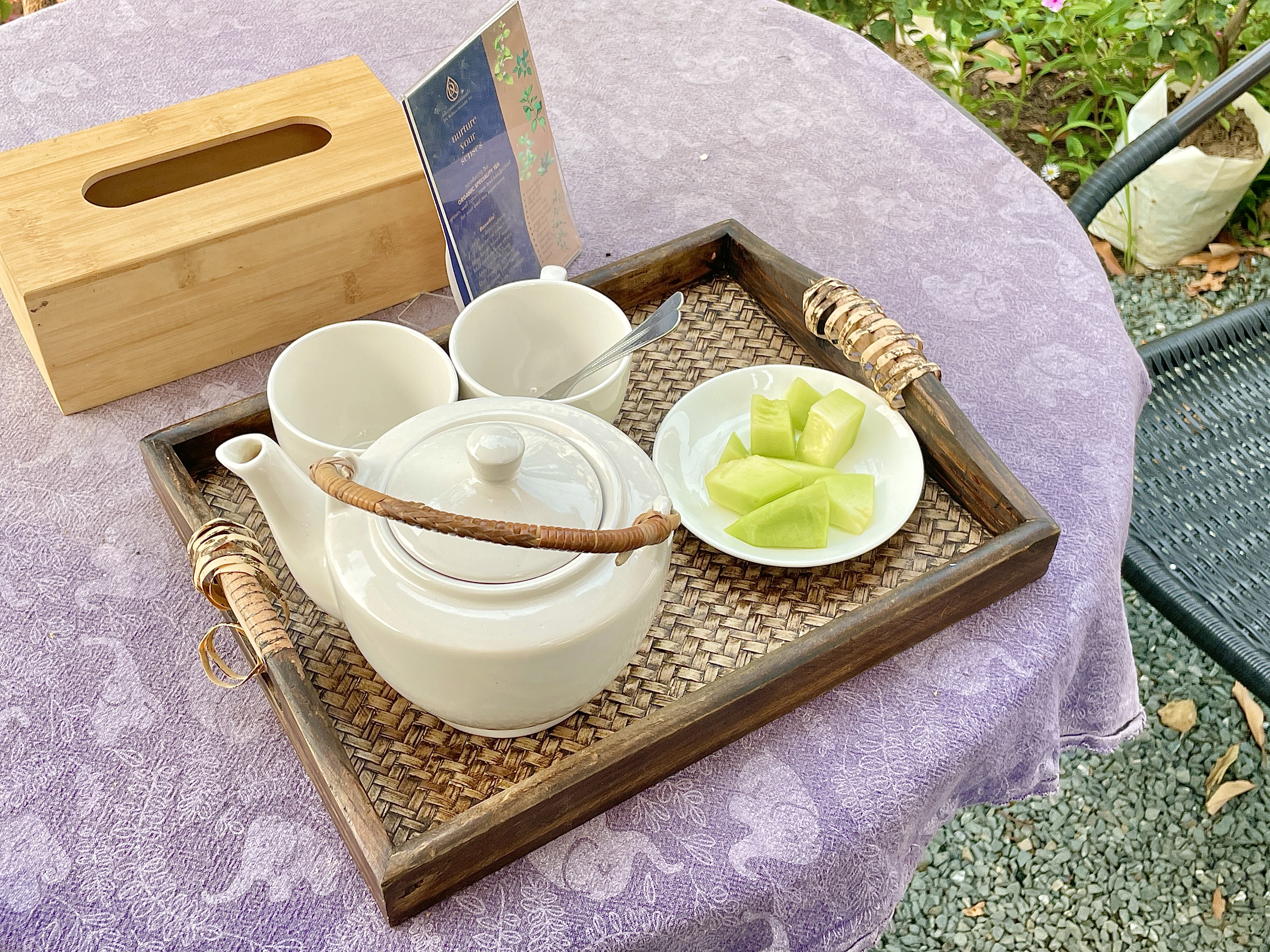 마사지가 끝나고 예쁜 정원에 따뜻한 차와 과일을 준비해주셨다.