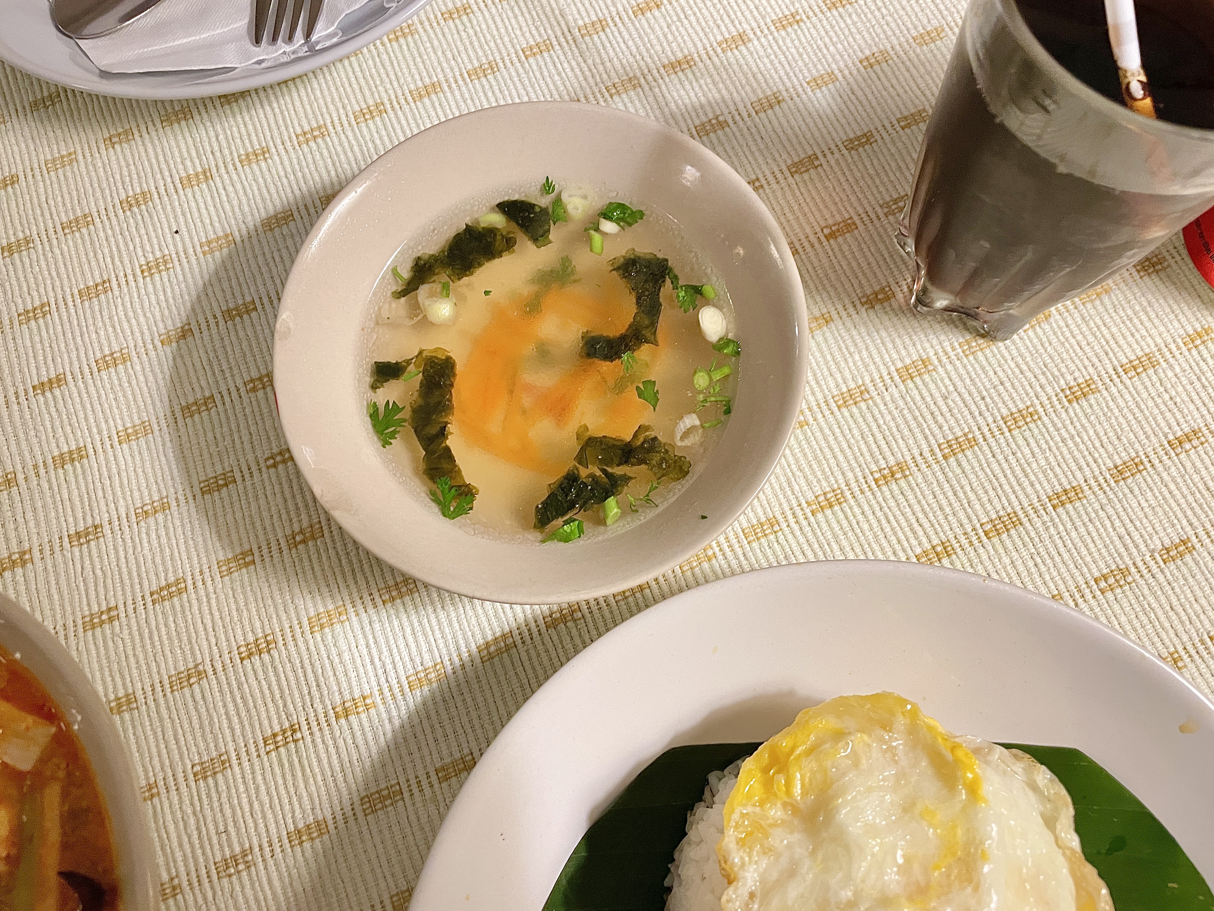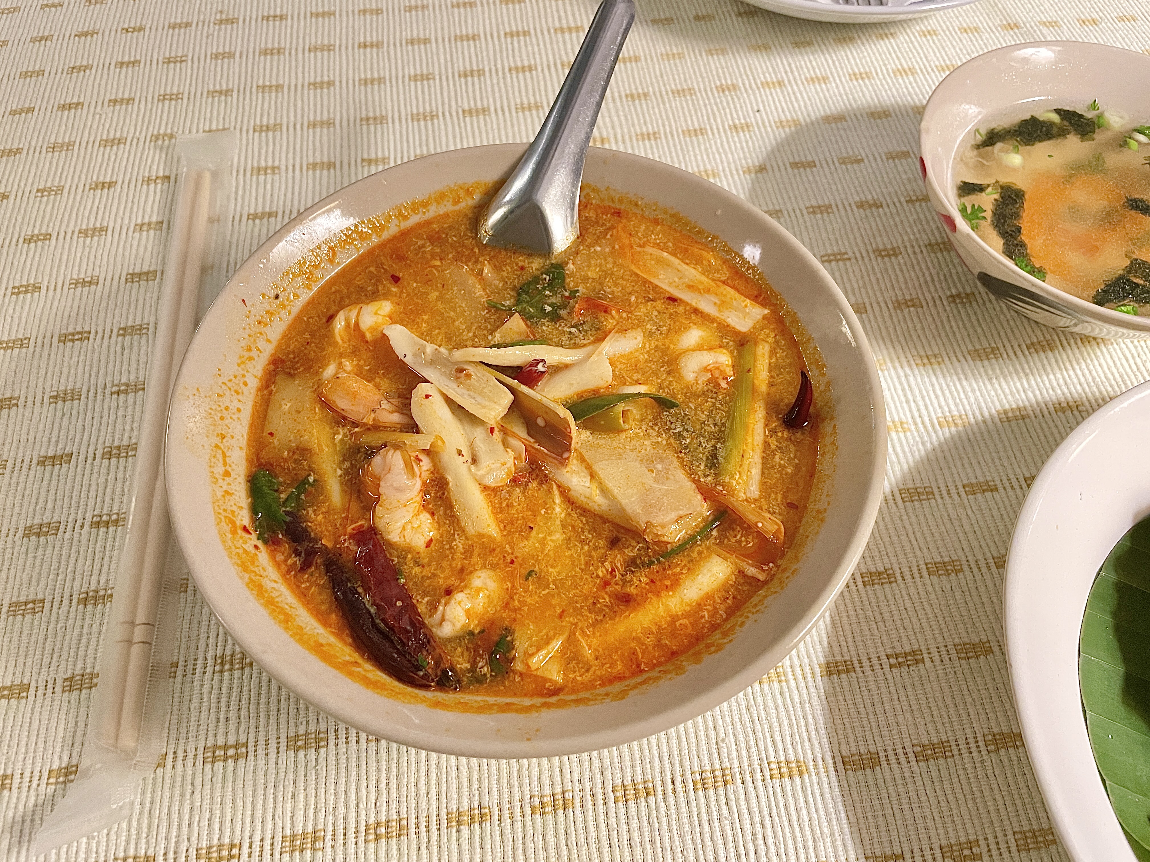 헝태우인 똠얌꿍은 재료가 적은 편이고 안에 들어 있는 갈랑갈이와 레몬그라스가 너무 질기다. 이것은 식당마다 달랐다.