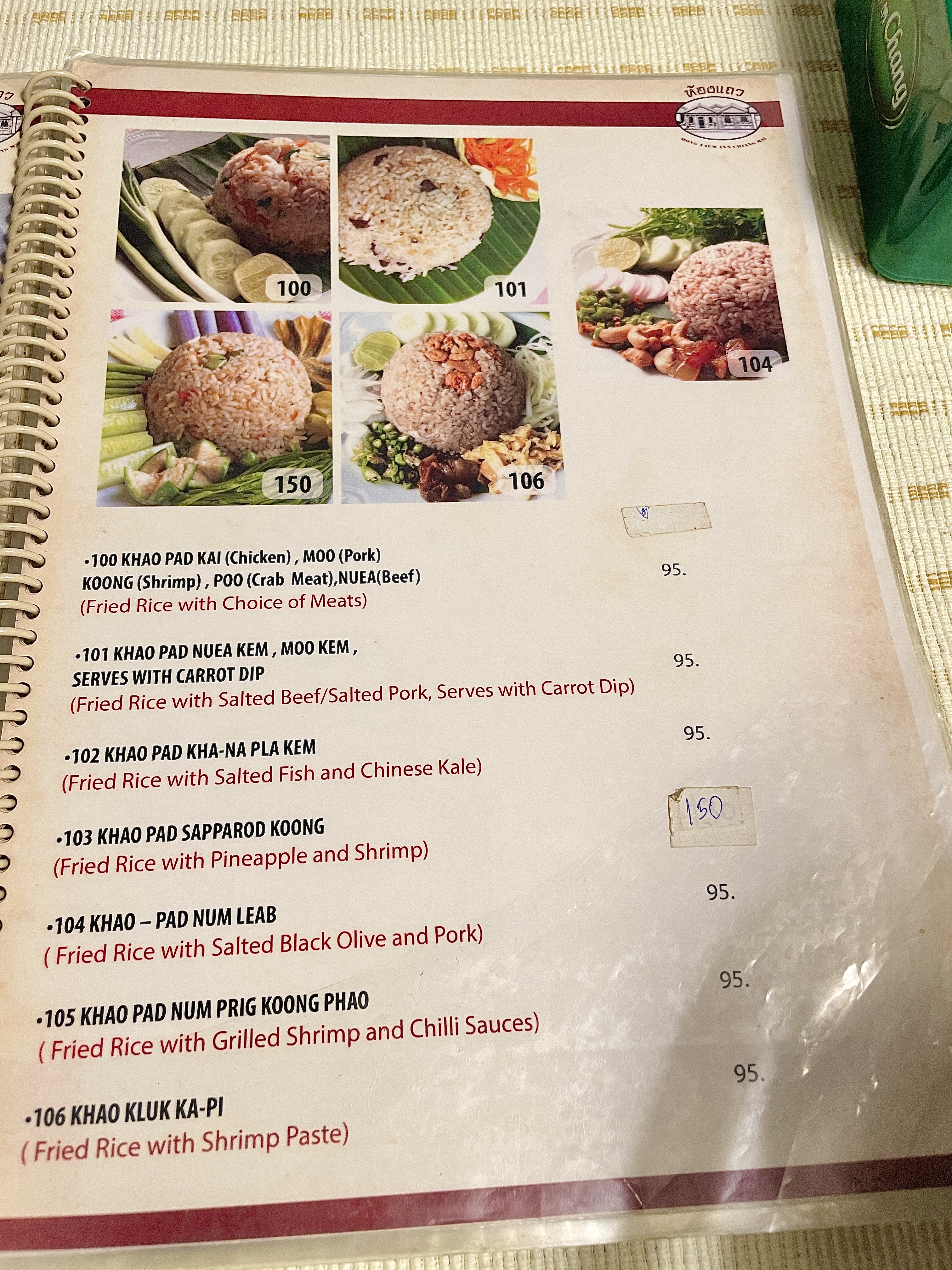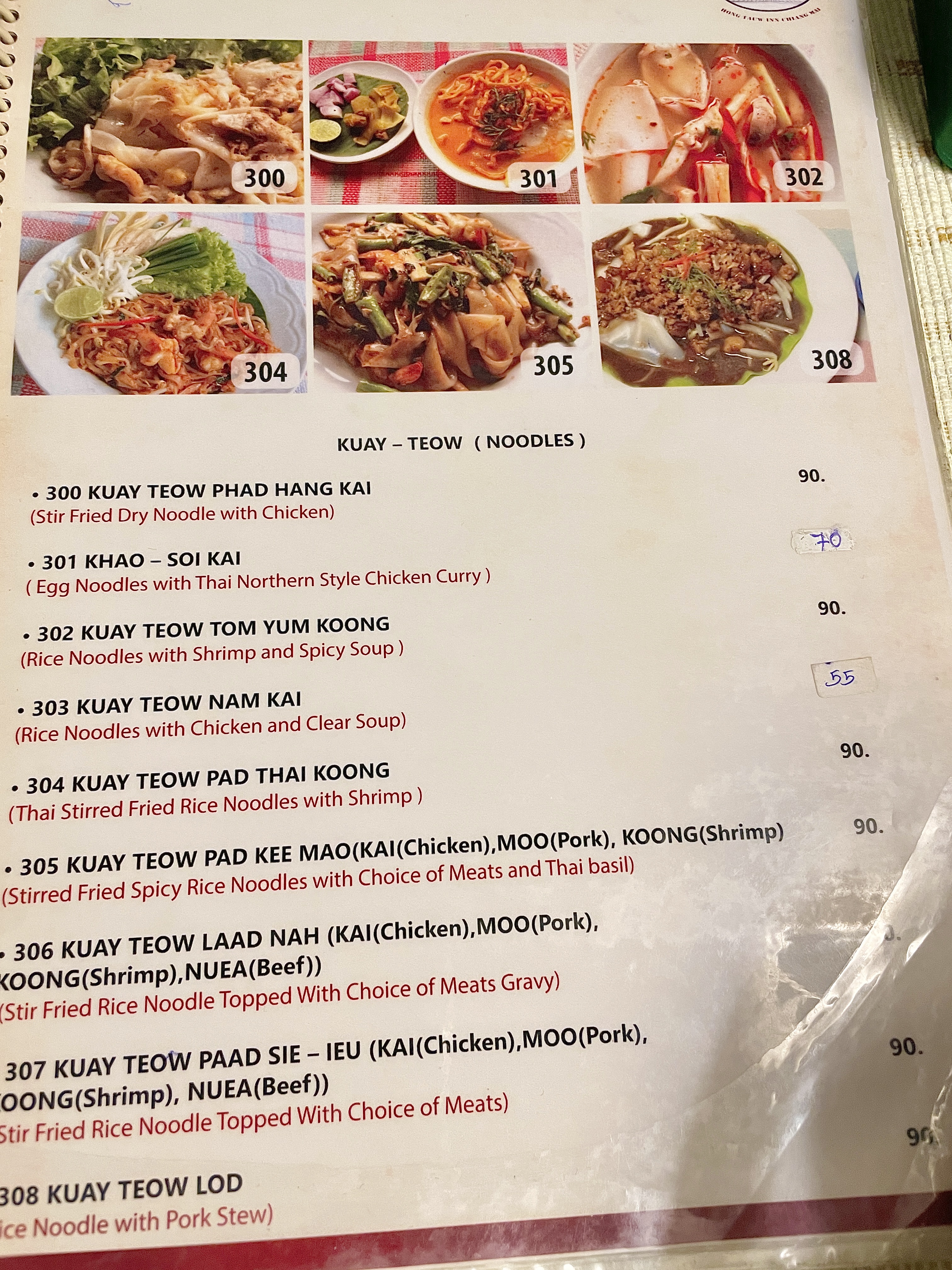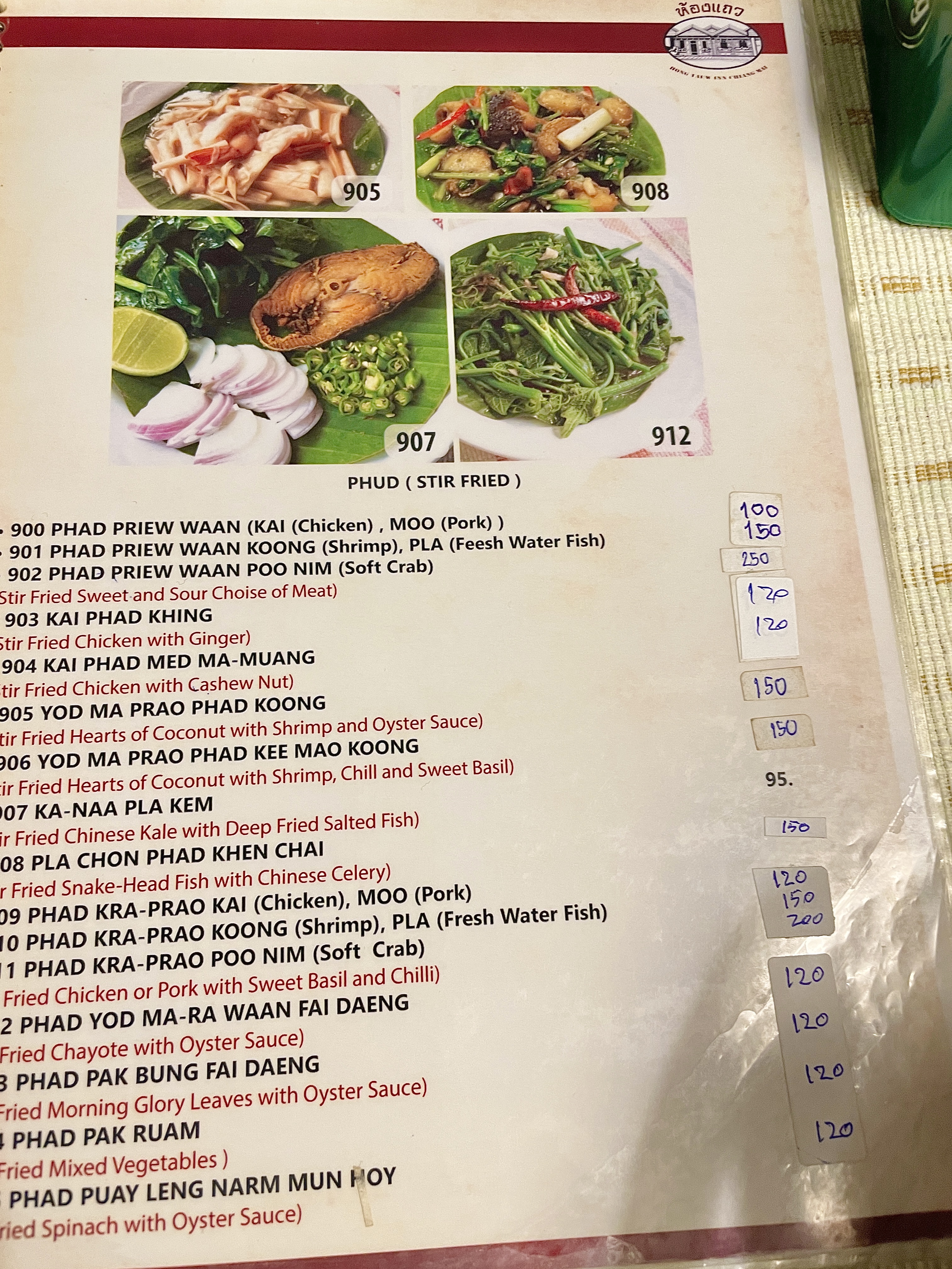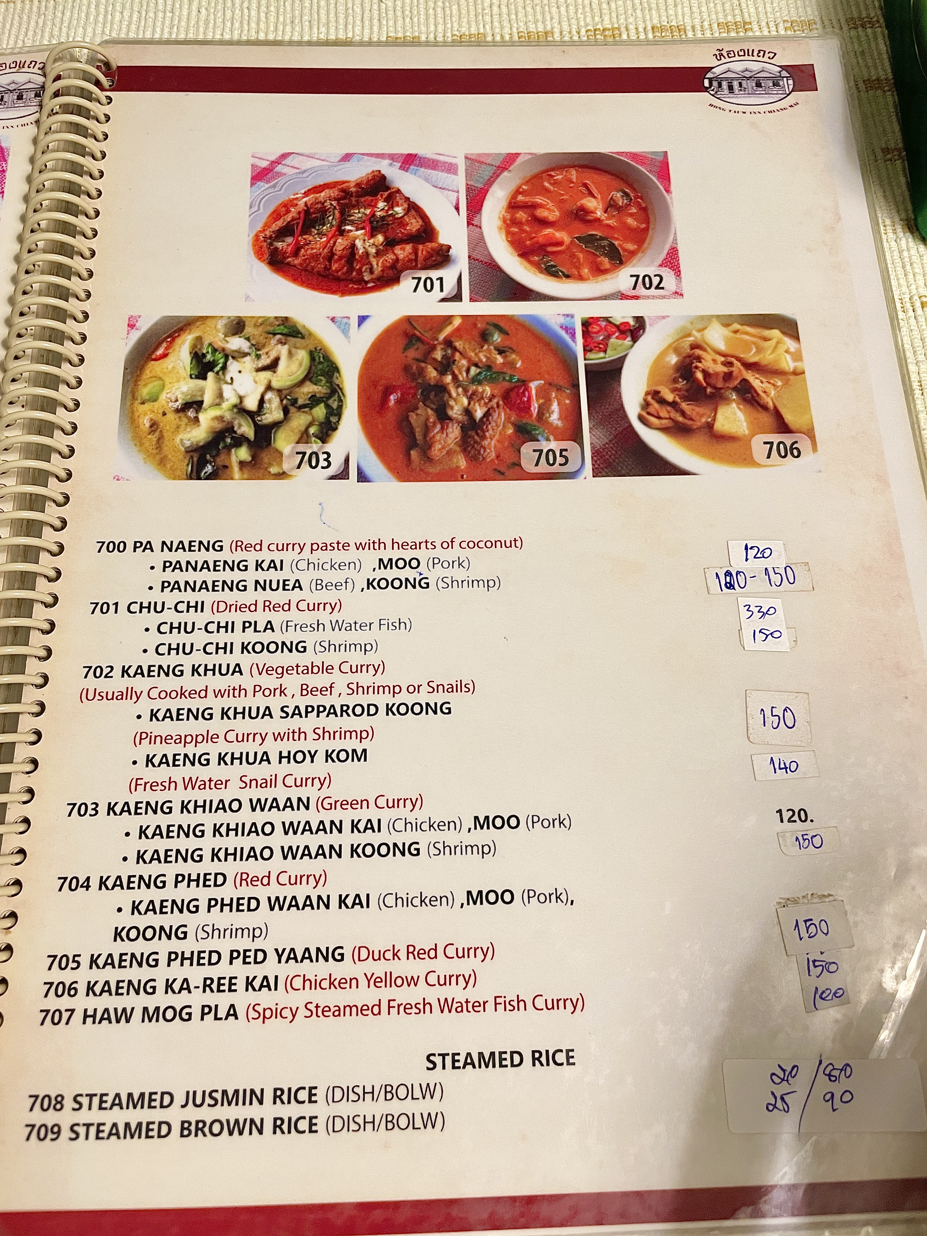 테이블마다 테이블보로 깔끔하게 정리되어 있었고( 간혹 잘 닦이지 않은 얼룩이 있기도 했고) 메뉴판은 영어와 태국어, 그림이 있어서 주문하기가 편했다.