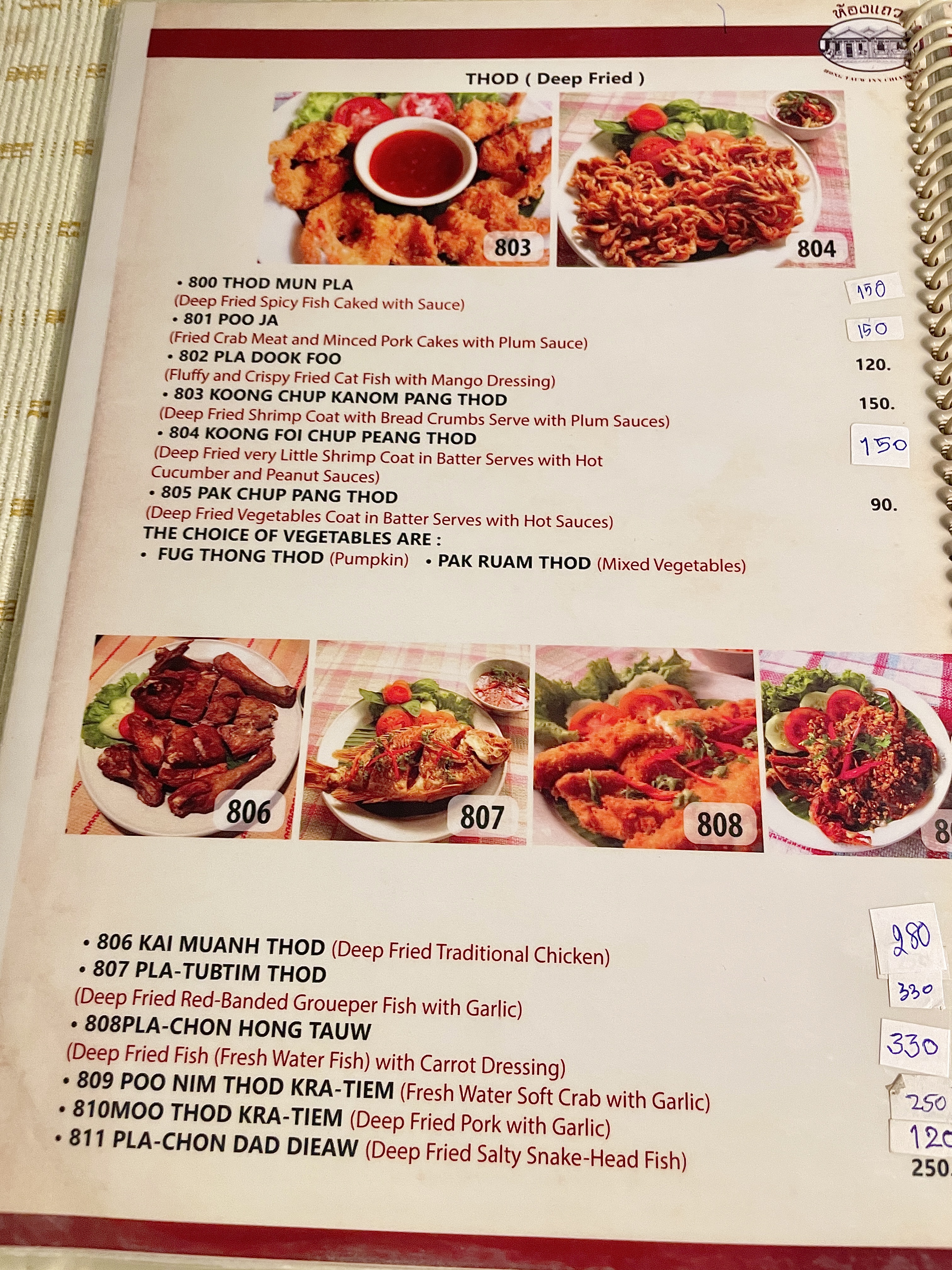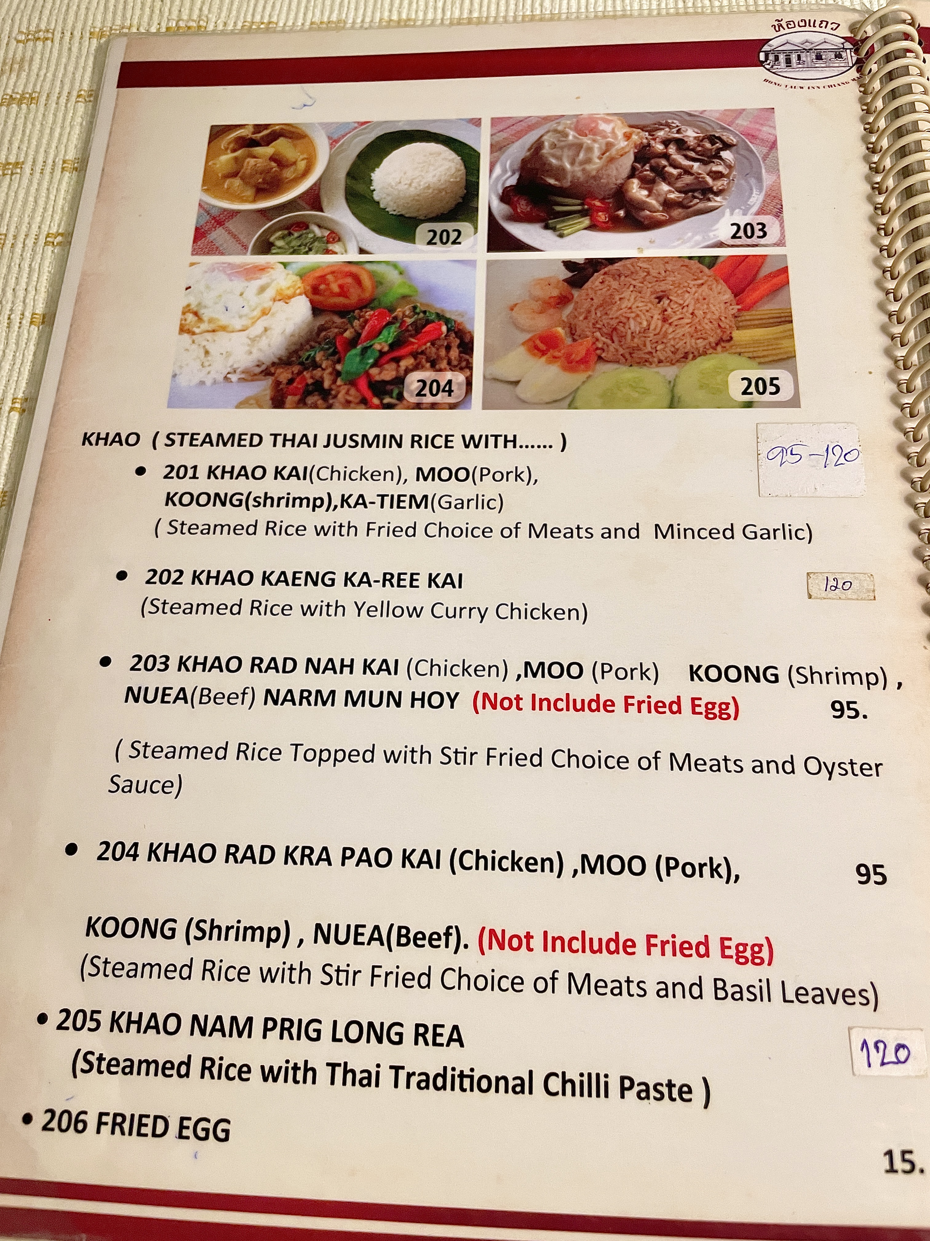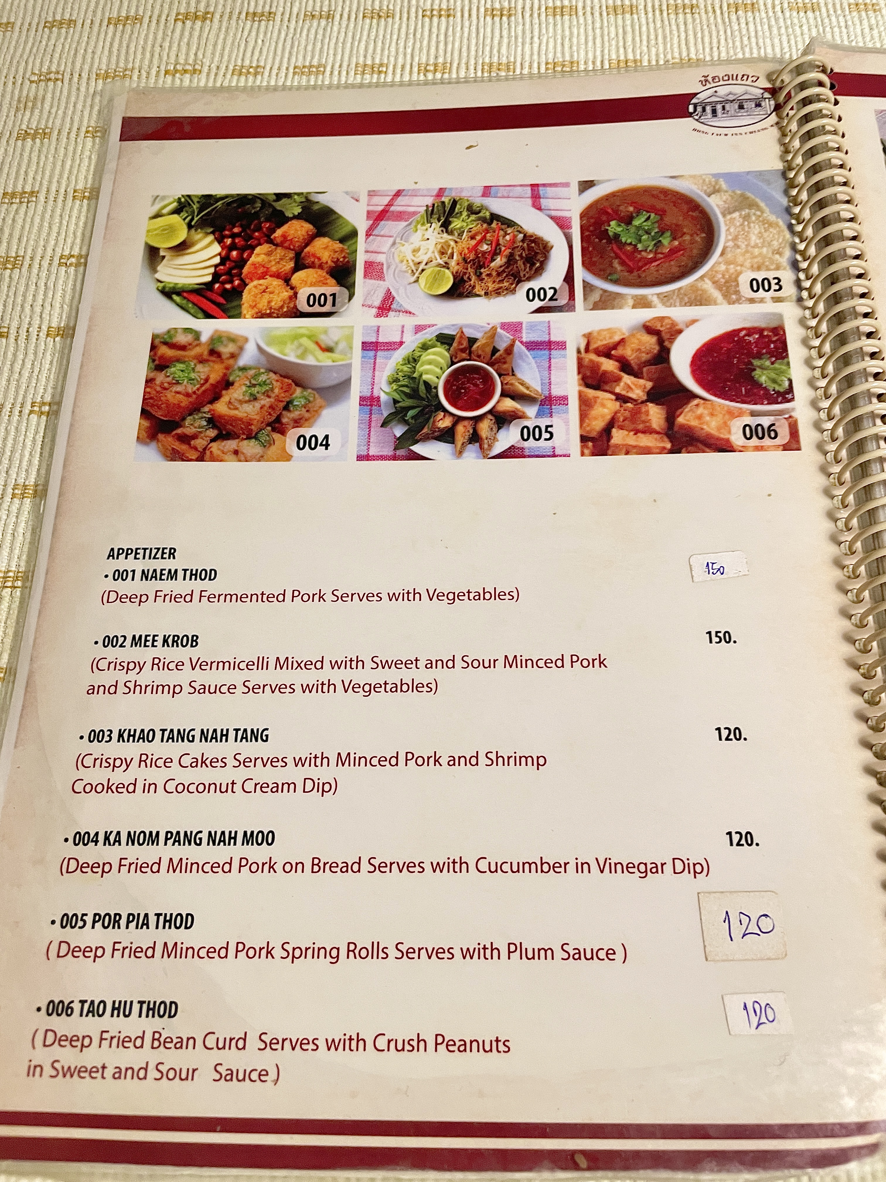 테이블마다 테이블보로 깔끔하게 정리되어 있었고( 간혹 잘 닦이지 않은 얼룩이 있기도 했고) 메뉴판은 영어와 태국어, 그림이 있어서 주문하기가 편했다.