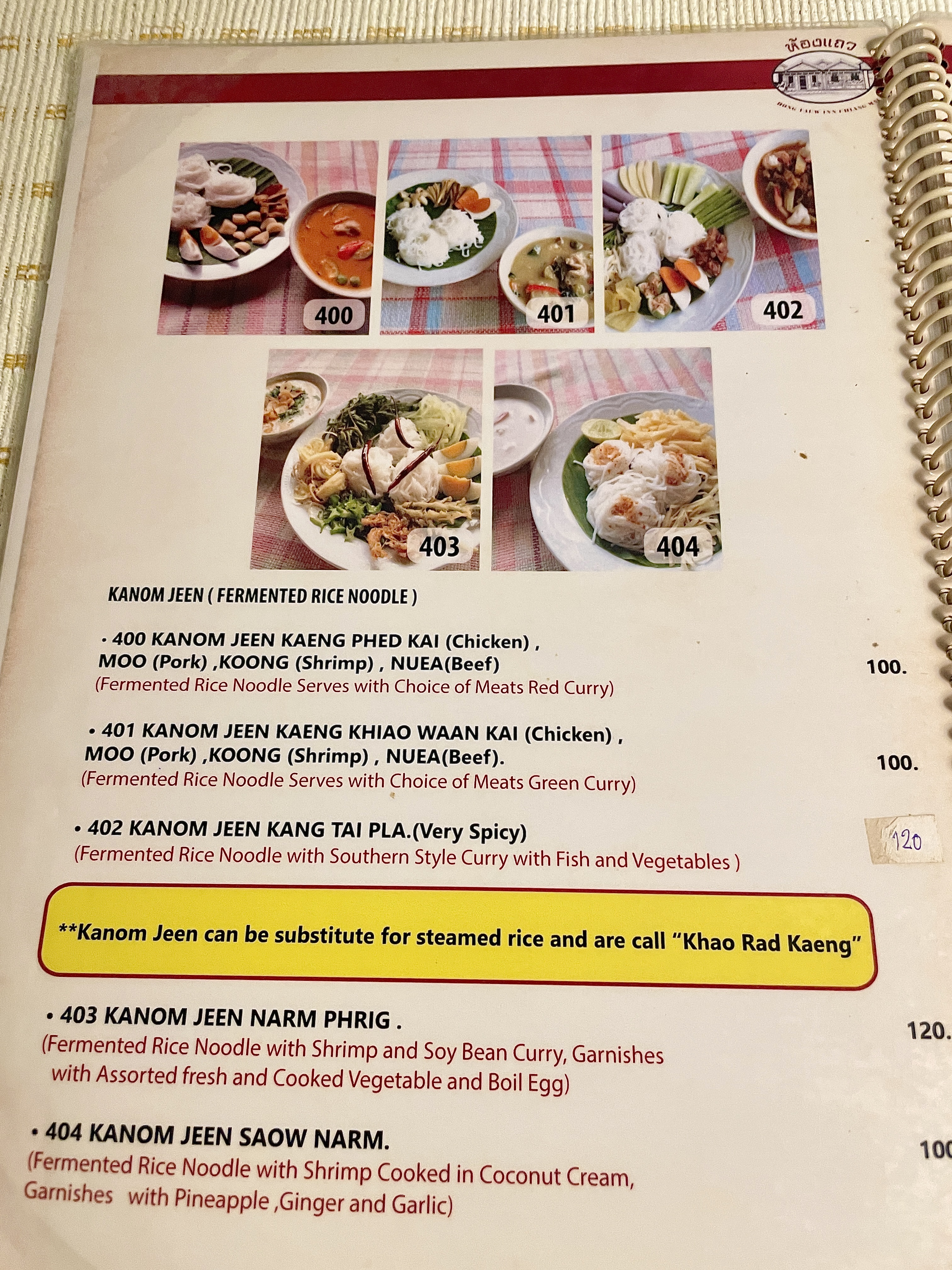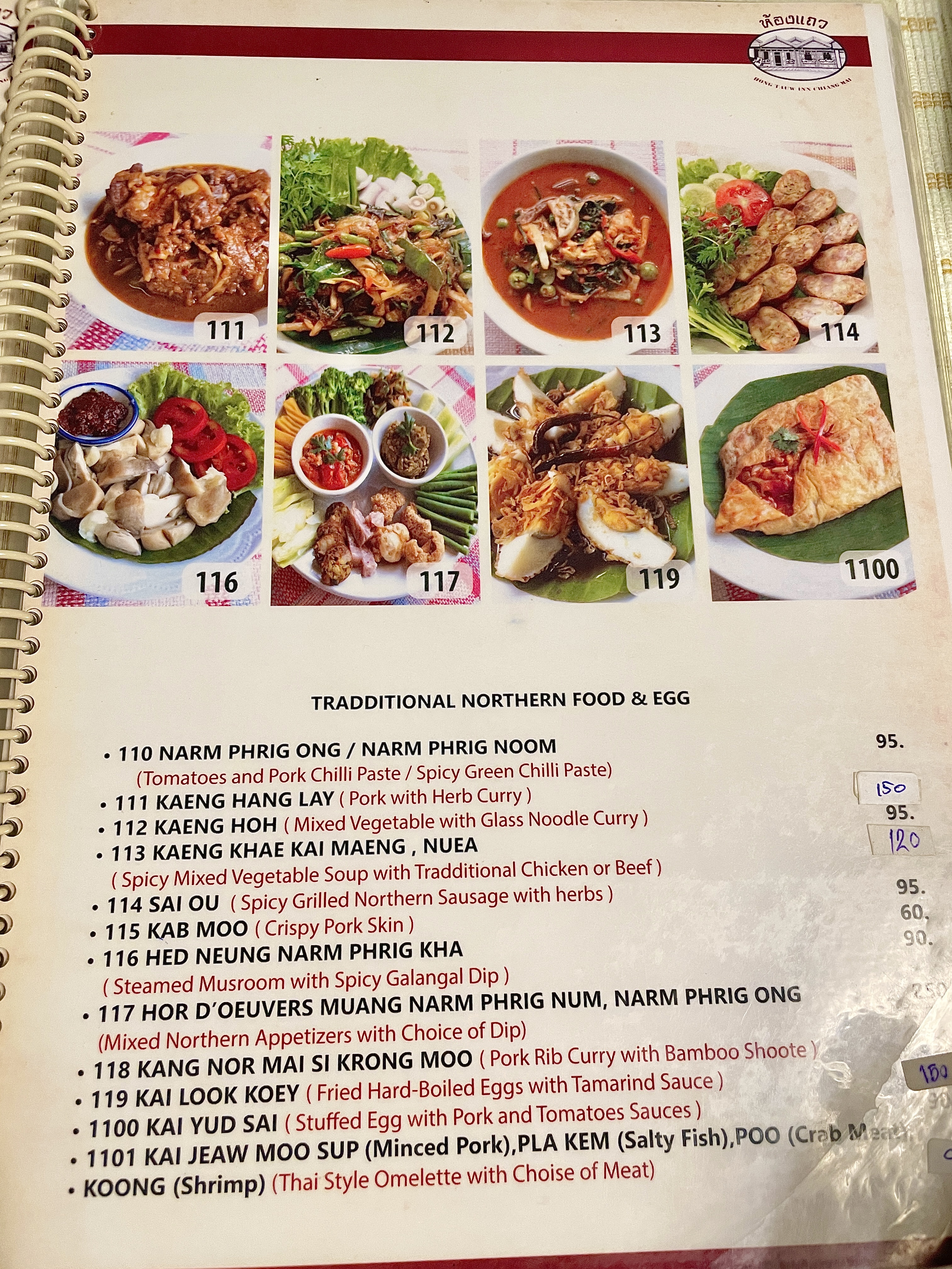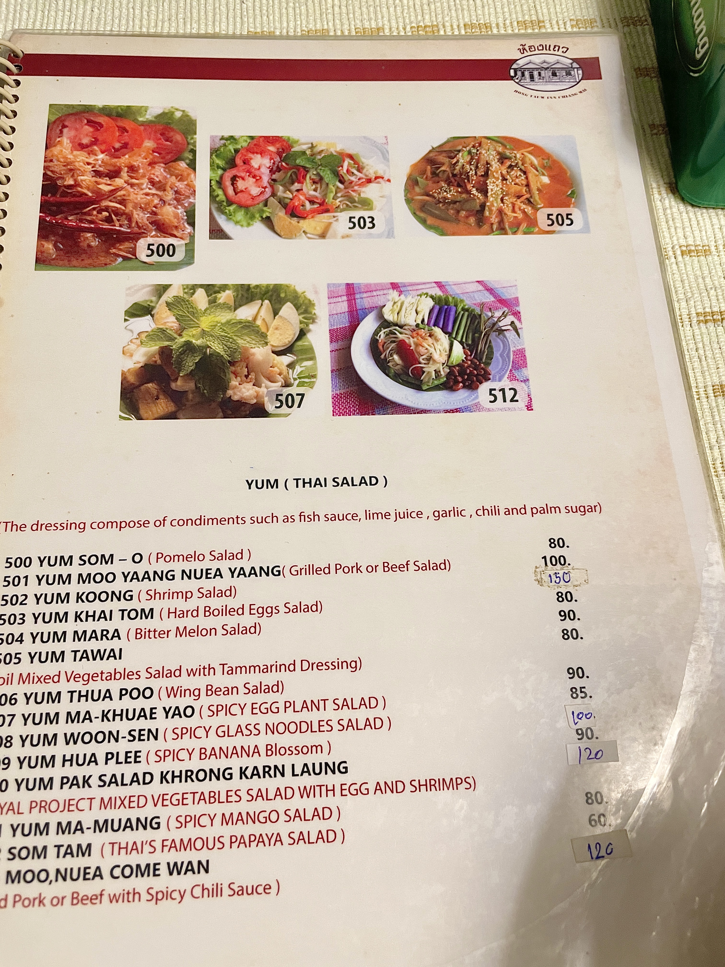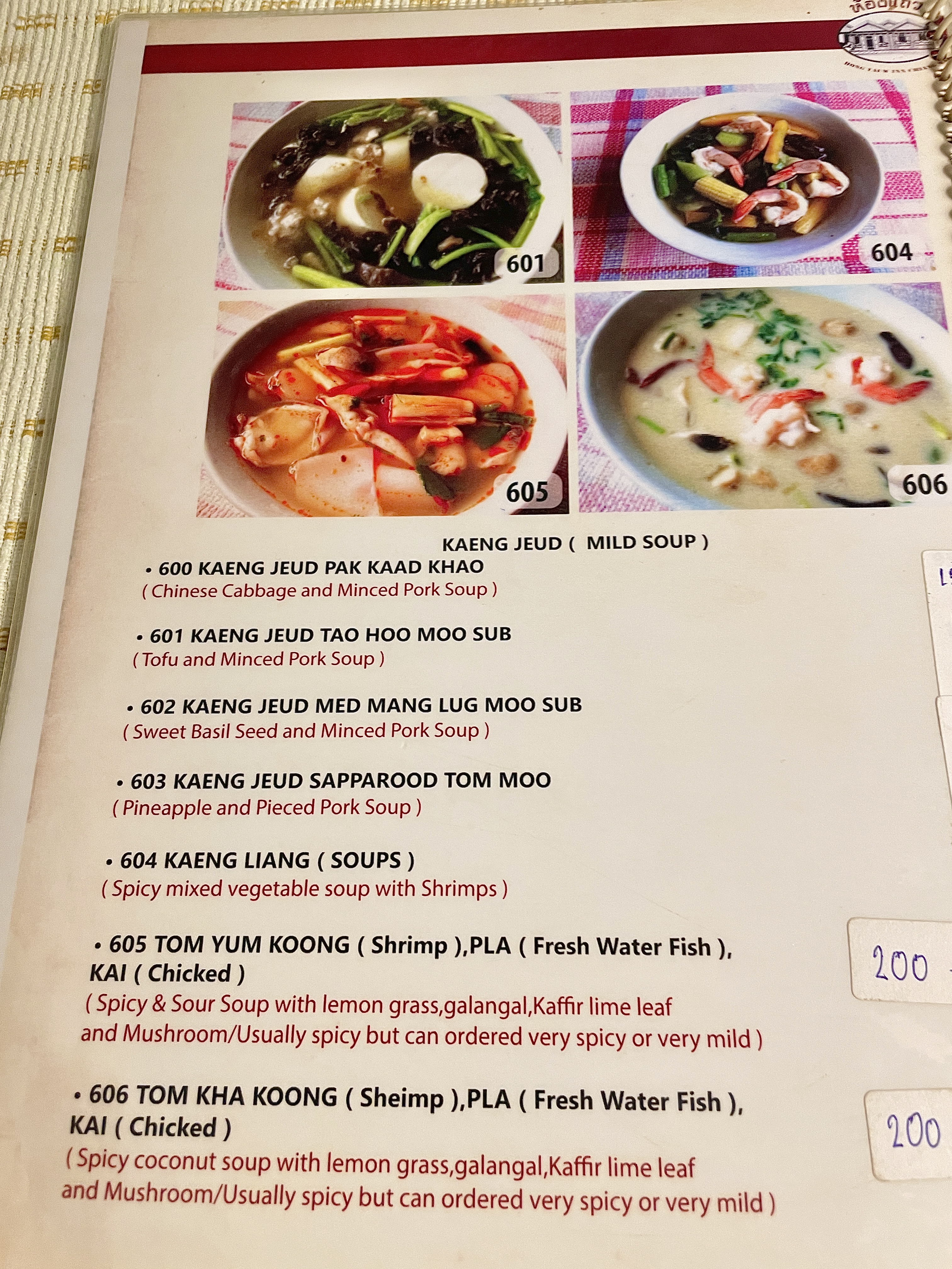 테이블마다 테이블보로 깔끔하게 정리되어 있었고( 간혹 잘 닦이지 않은 얼룩이 있기도 했고) 메뉴판은 영어와 태국어, 그림이 있어서 주문하기가 편했다.