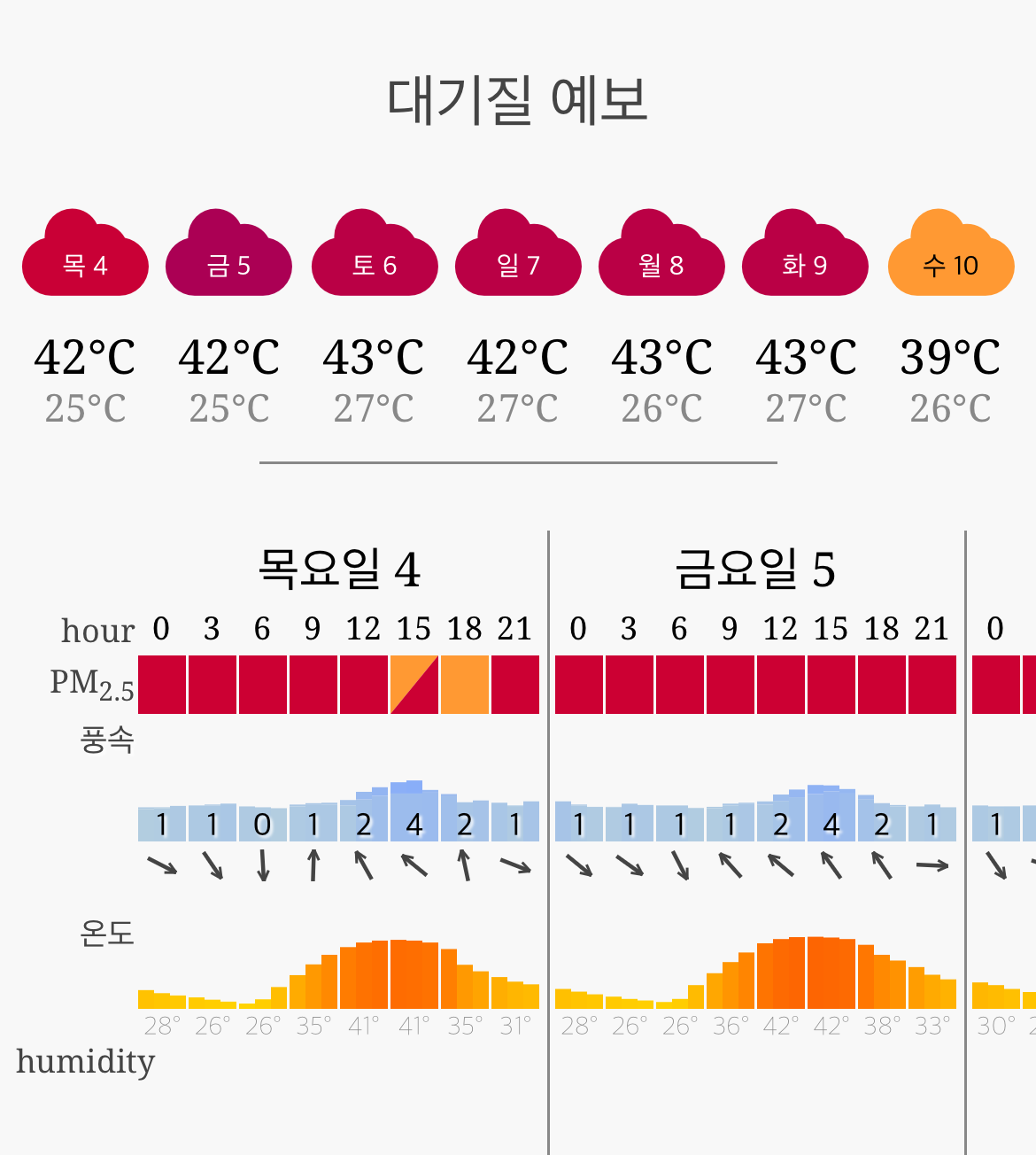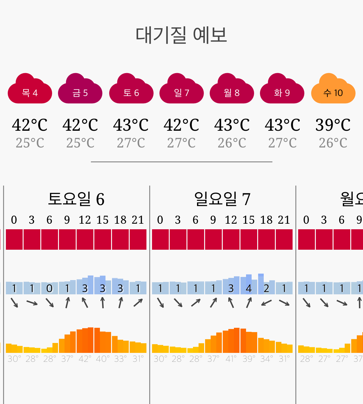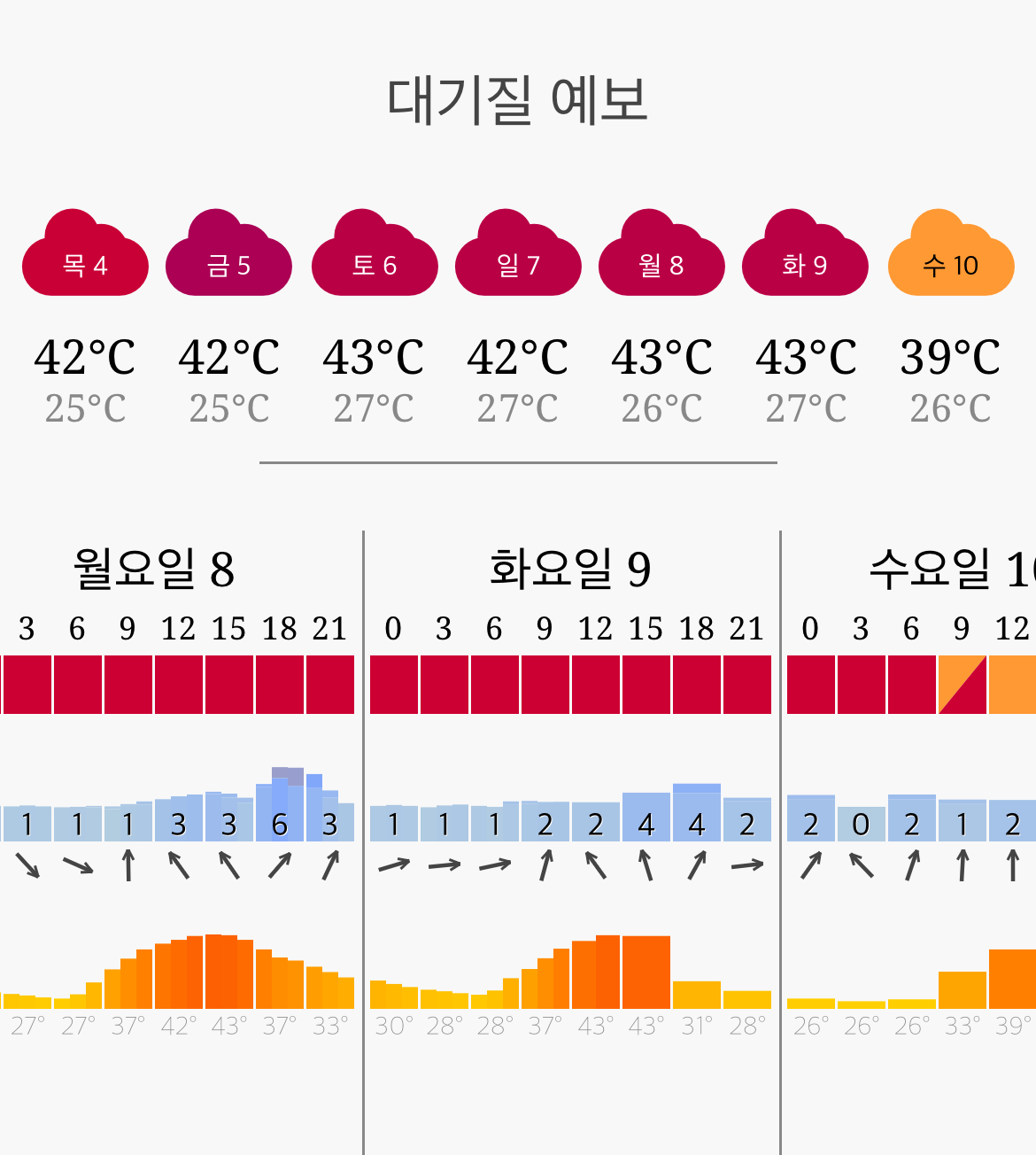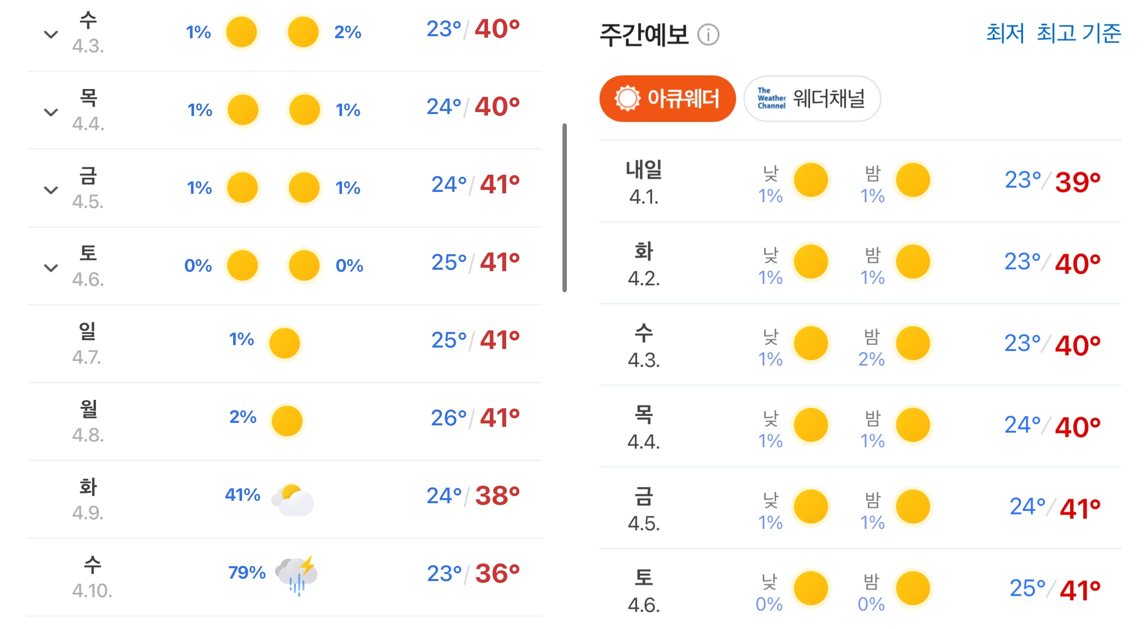 아침, 저녁 20~25도 내외 / 오후 40도 내외
