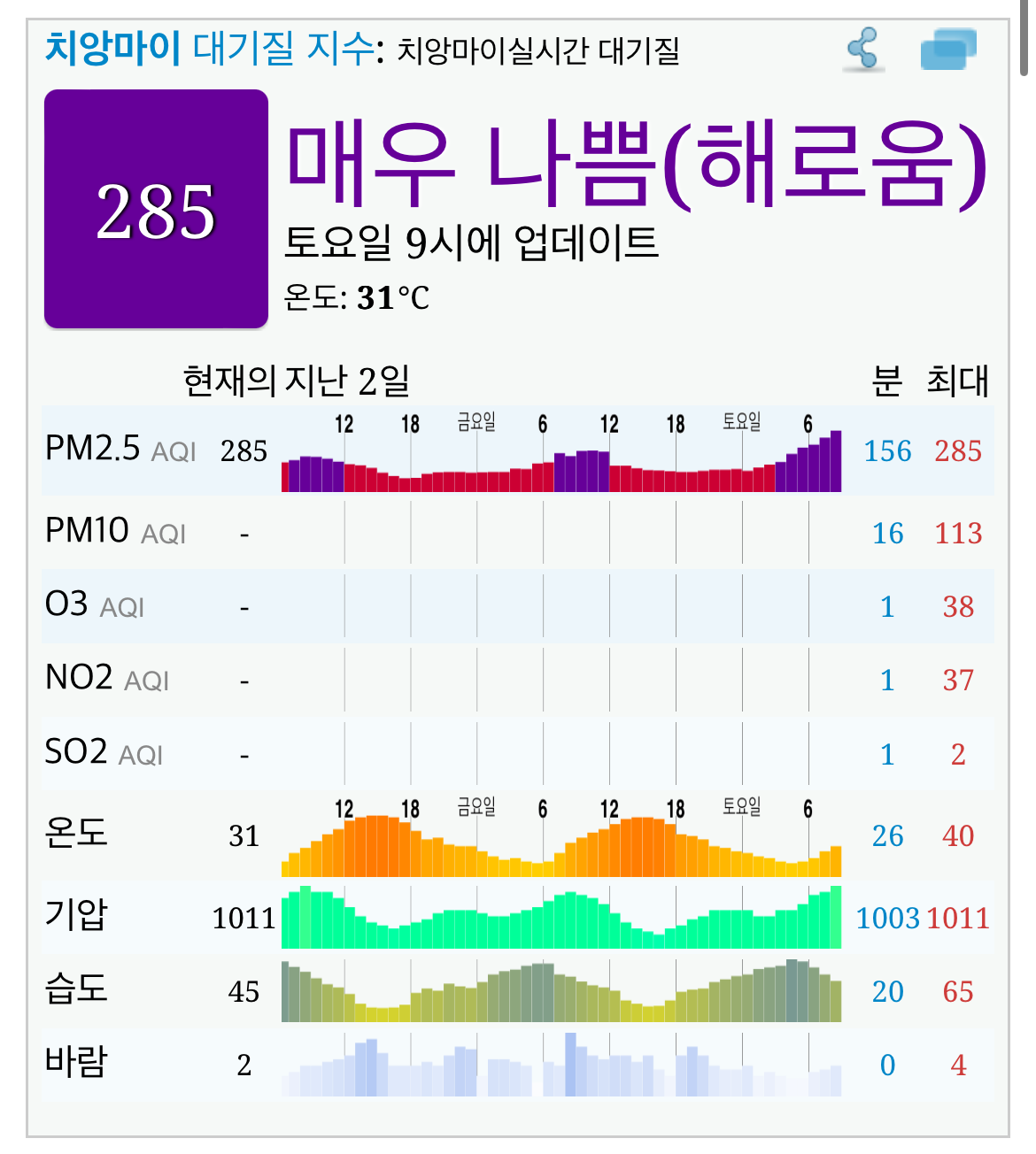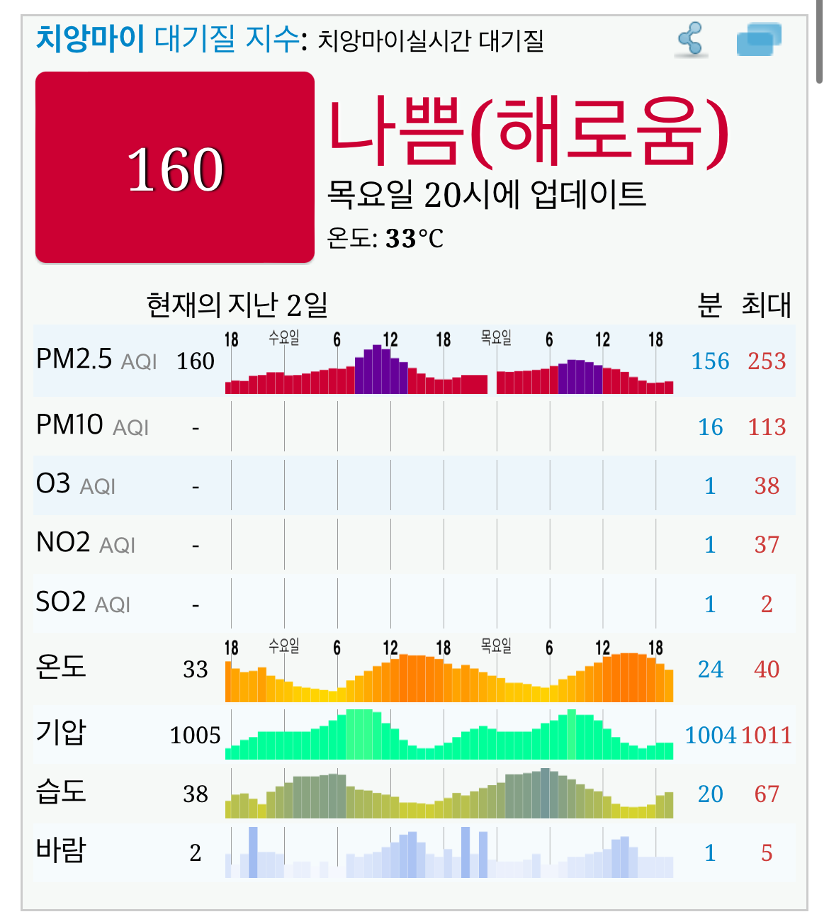 내가 여행했던 4월초는 평균 200~300 정도로 더 심한 경우에는 500까지 올라간다고 한다.